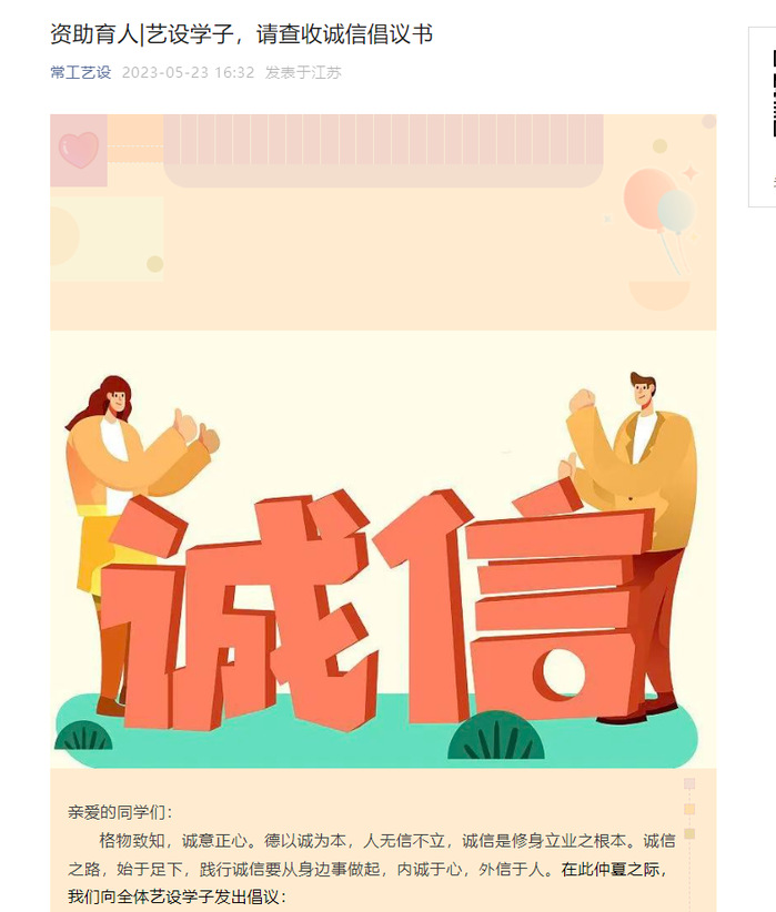 5月23日,BBIN宝盈集团在官方微信公众号发表诚信倡议书,号召同学们修身立信、诚信处事、诚信应考、诚信学术、诚信求职、诚信离校、诚信还贷,并通过转发qq群、微信群、在公告栏张贴诚信倡议书等方式扩大影响力。